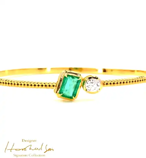 Natural Zambian Emerald & Diamond Bangle in 18K Yellow Gold